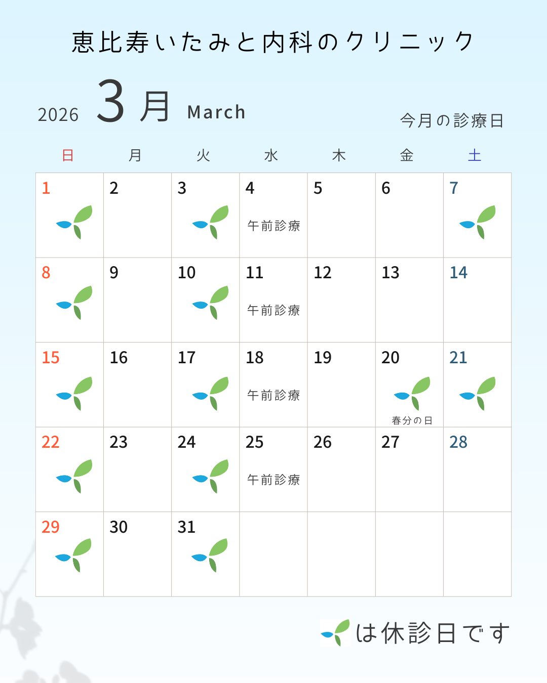休診日:火曜、第1・3・5土曜日、日曜、祝日、年末年始